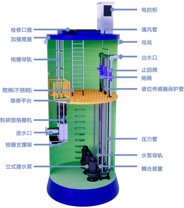筒体:一体化预制泵站筒体结构由纤维缠绕玻璃钢(GRP)制成,采用意大利 公司设备,全自动化控制连续缠绕成型,确保厚度均匀并达到设计的刚度,质量稳定优良。