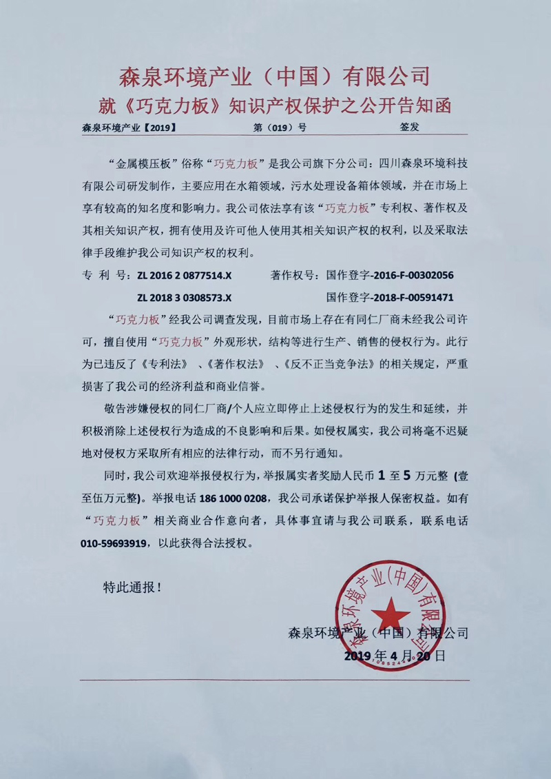 公司荣评“四川省环保产业50强”、“四川省诚信民营企业”、“升级服务型制造示范企业”等称号。国家知识产权拥有百余项专利和商标,如:“森泉”、“森泉智水”等核心商标,自主研发生产能力突出。