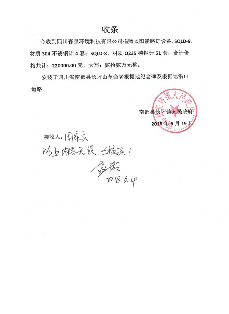 点亮道路,温暖人心。长坪山是红军革命根据地,我企业在自身发展壮大的同时,主动承担起社会责任,为纪念烈士、脱贫攻坚、乡村振兴贡献我们的力量。