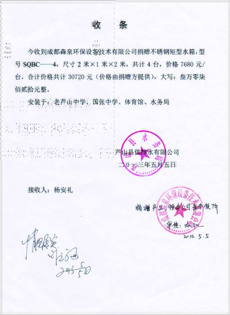在“2008年汶川地震”和“2013年芦山地震”抗震救灾活动中,森泉积极支持灾区人民灾后维护、重建工作。公司上下捐款、捐物,森泉的经销商也迸发出的热情,捐款、捐物、现场救援……并为老芦山中学、芦山国张中学、芦山体育馆、芦山税务局、彭州市小鱼洞集中安置点提供森泉制造水箱,有效地改善震区人民灾后用水问题。